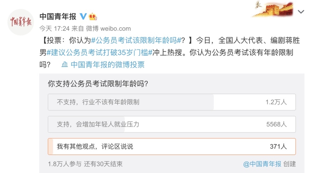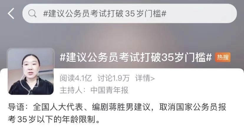 3月7日,话题#建议公务员考试打破35岁门槛#冲上热搜第一。